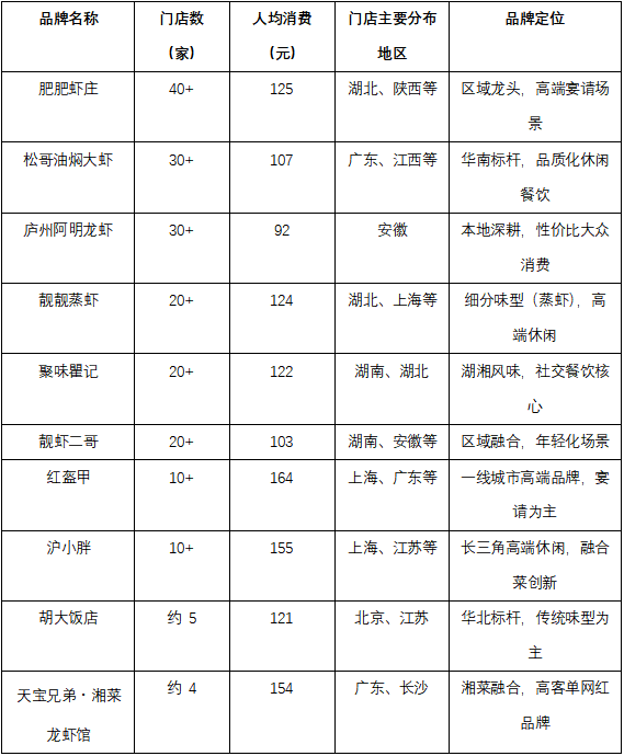 2.人均消费分层明显:一线城市品牌(红盔甲、沪小胖)人均消费超150 元,区域大众品牌(庐州阿明龙虾)人均消费不足100元,适配不同层级消费需求;