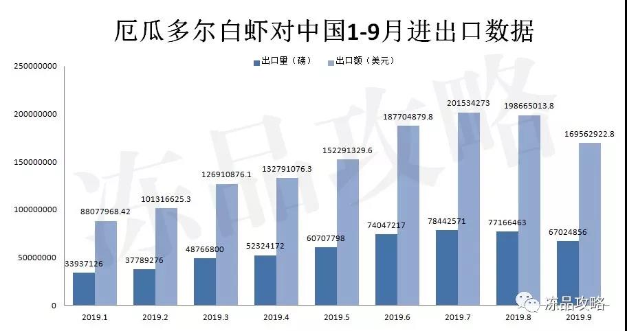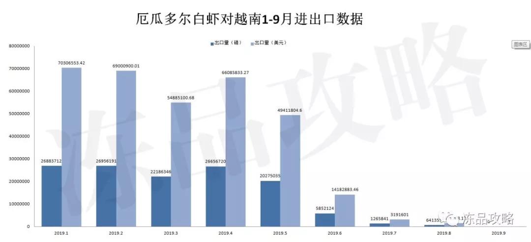 9月份厄瓜多尔白虾对越南海防港发货量已降至0,自从2019年一月份以来,厄瓜多尔对越南出口直线下降,已从1月份13495.95吨下降至8月份290.91,再到9月份0吨,在这半年中,中国对边贸虾打击力度加大,逐步实现了零边贸产品。
