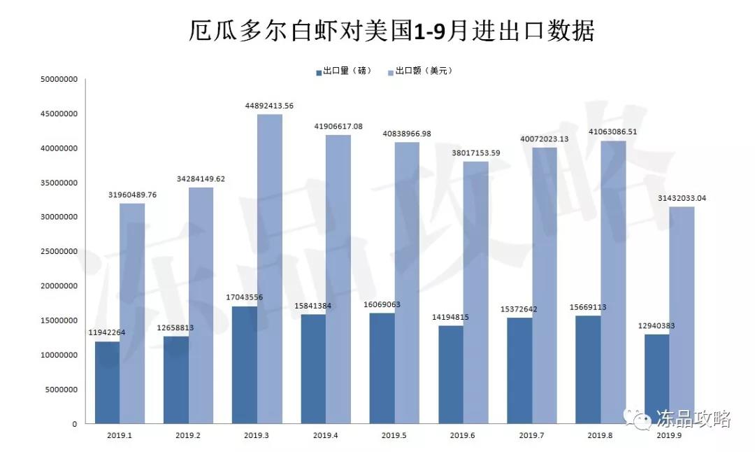 另外,厄瓜多尔另外一主要市场美国出口也有所下降,9月份厄瓜多尔白虾对美国发货量为5869.65吨,出口额为31432033.04美元,同比8月7107.39吨下降1500吨左右,下降比例为17.41%。