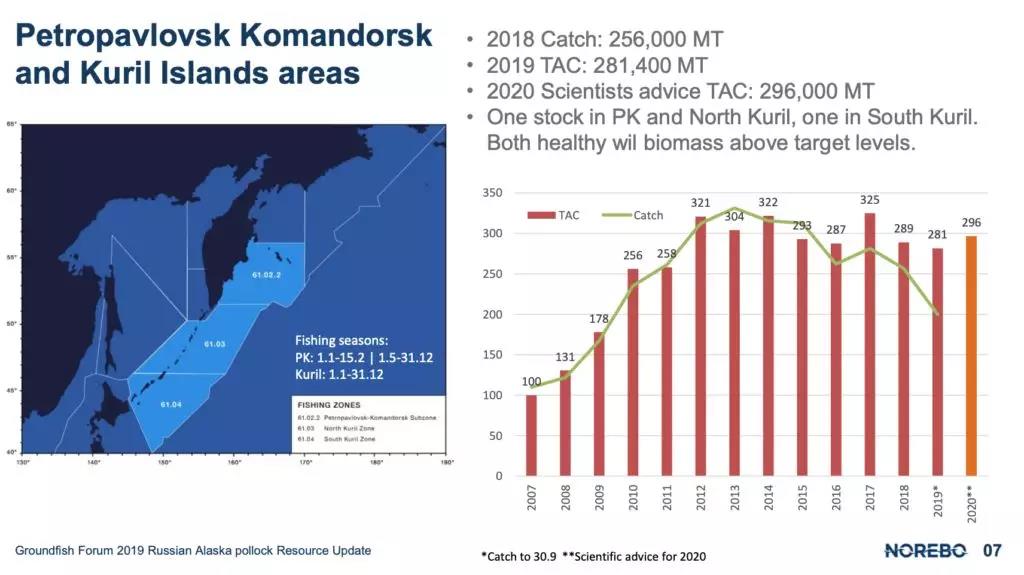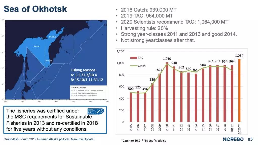 鄂霍次克海狭鳕产量占俄罗斯全国的60%,2019年捕捞限额为96.4万吨,而科学界建议,该海区2020年的配额可增加10万吨,至106.4万吨。