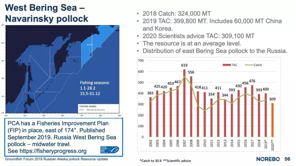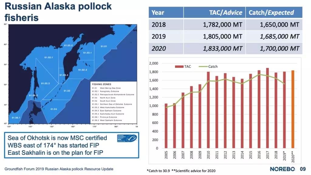 而今年的五月份,俄罗斯狭鳕渔业协会(PCA)启动白令海“渔业改良项目”(FIP),意在2024年前让西白令海狭鳕产业通过MSC认证,将捕捞限额下调23%至30.9万吨。