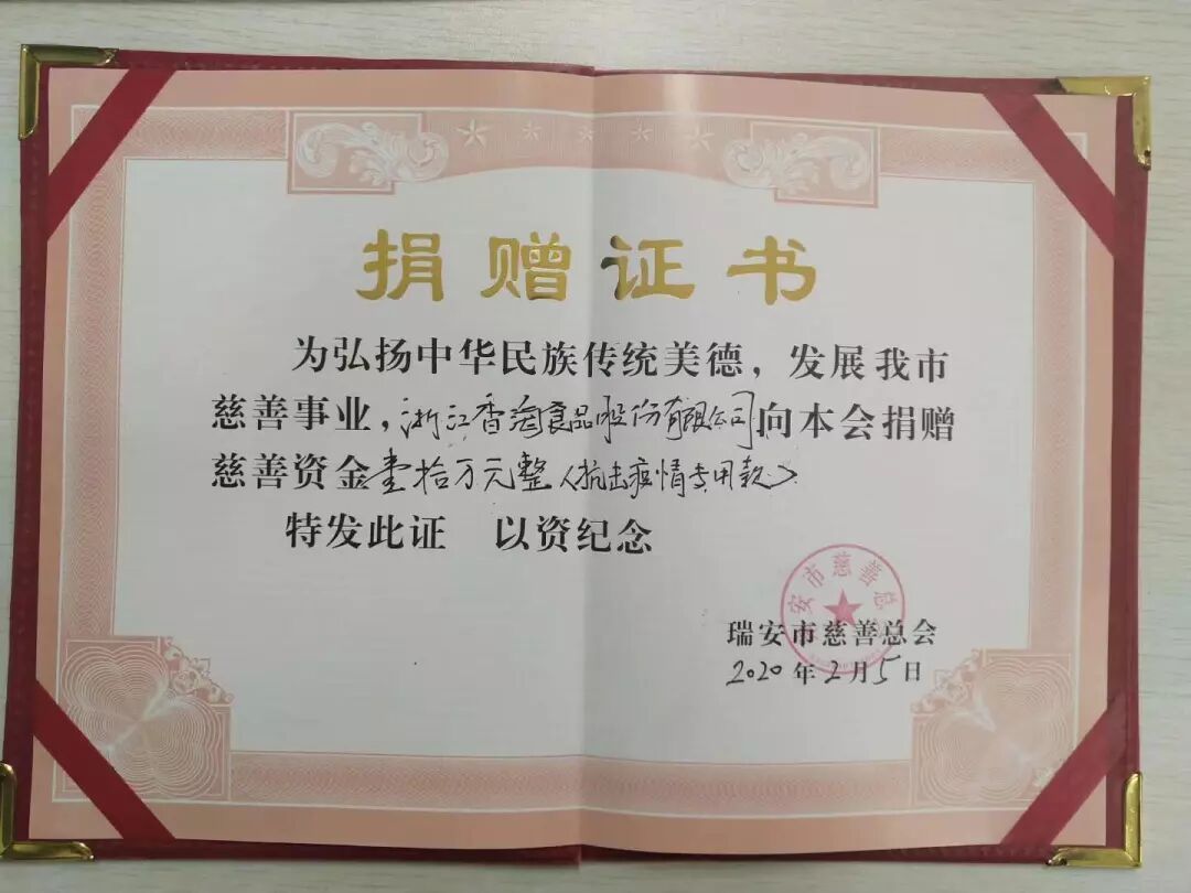 2月5日,浙江香海食品股份有限公司向瑞安市慈善总会捐赠慈善资金10万元,专用于抗击新冠肺炎疫情。