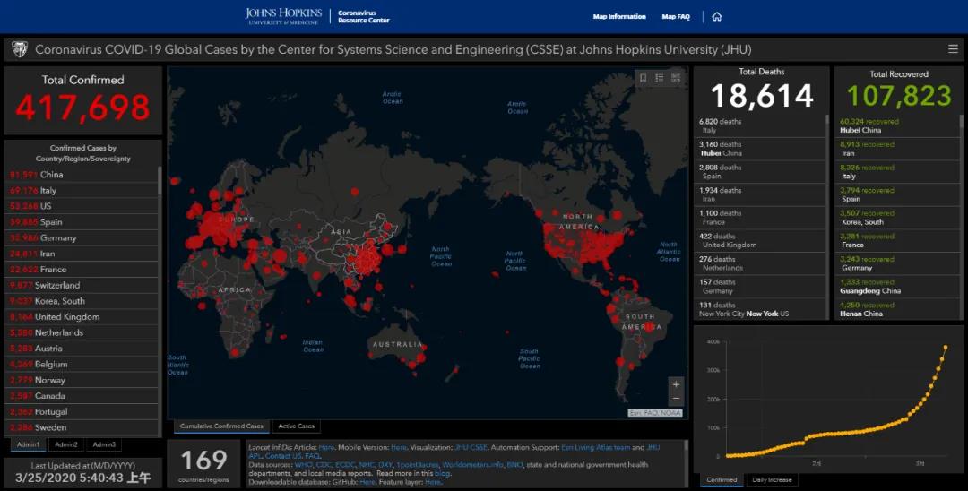 美国约翰斯霍普金斯大学统计,截止2020年3月25日上午,全球新型冠状病毒(COVID-19)肺炎确诊病例上升至417,698例,死亡18,614例。印度感染人数为536例,死亡10例。
