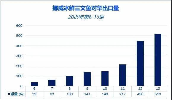 截至今年前三个月,挪威三文鱼对华出口量共3,833吨,同比下降38%。今年第13周, 挪威向中国出口了519吨冰鲜三文鱼,较前一周增长15%。此外,第12周的出口量较11周翻番。