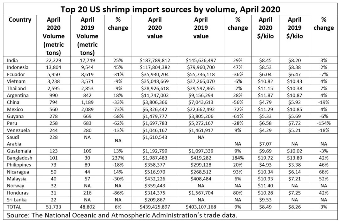 NOAA数据显示,印度和印尼白虾到货量呈较大增幅。作为美国第一大白虾供应国,今年四月份到货量为22,229吨,较去年同期增长25%,货值1.88亿美元,增长29%。印尼是美国第二大虾类供应国,四月份到货量为13,804吨,同比增长45%,价值1.12亿美元,同比增长47%。从数据上看,印度和印尼白虾的价格变动较小。