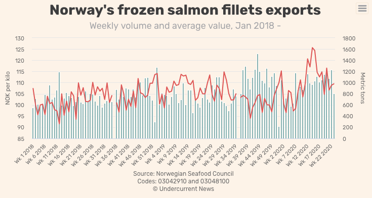 挪威海产局(NSC)统计,2020年第23周,挪威出口13,495吨冰鲜三文鱼(整条鱼),出口量较上一周(16,358吨)下降18%,较上年同期增长6%,一周内出口单价从NOK 64.32/kg上涨至NOK 69.15/公斤,较去年同期上涨12%。