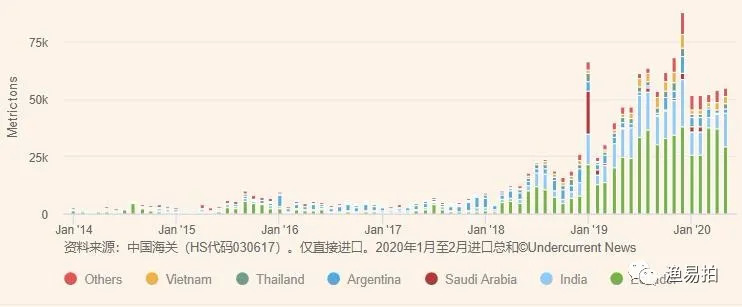 中国从厄瓜多尔进口了2.9万吨虾,环比下降21%。中国从印度进口了14,600吨,环比增长128%。