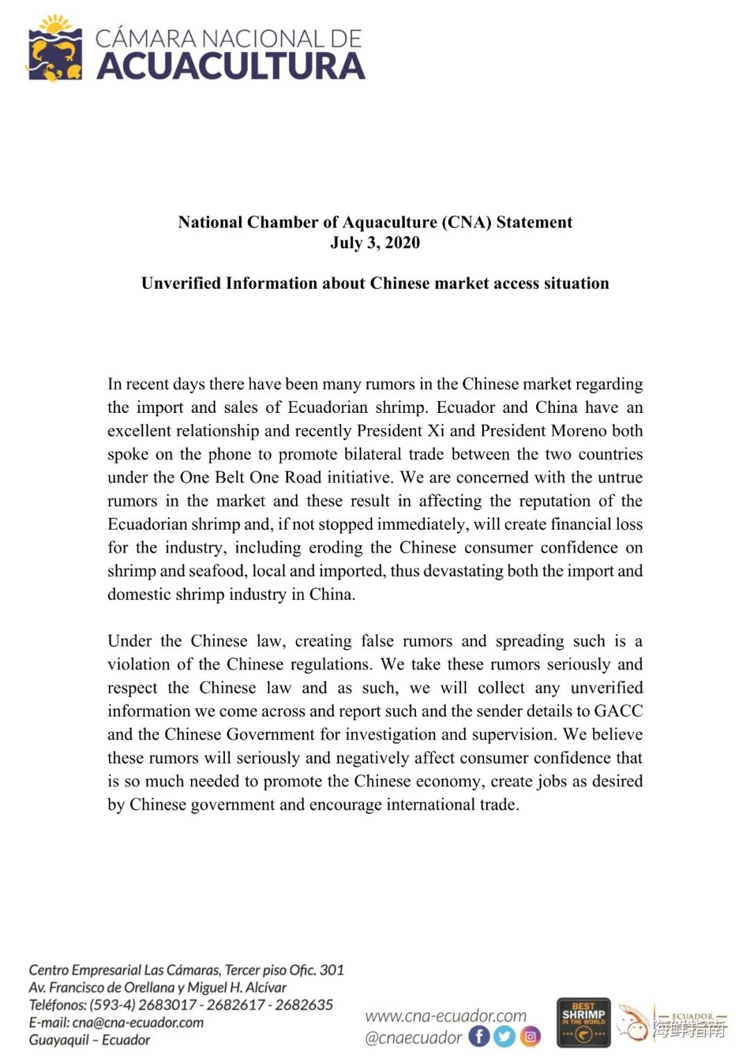 直至7月5日下午,有白虾业者在朋友圈发布了一份“厄瓜多尔国家水产养殖协会(CNA)关于不实传言的通知”: