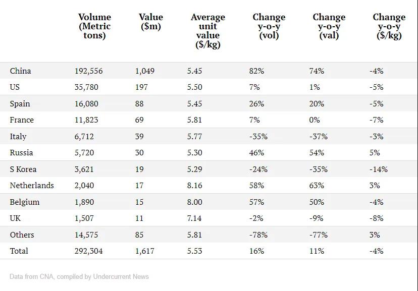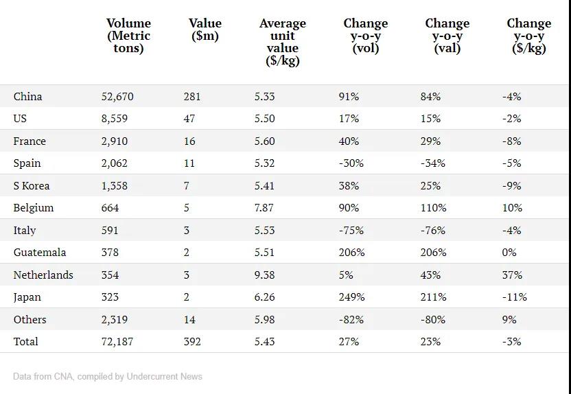 其中,出口中国的数量达到52,670吨,较上月增长11%,出口额2.81亿美元,增长10%。除中国外,五月份厄瓜多尔白虾在其他国家市场的销量也在增长,美国市场出口量8,500吨,环比增长13%,同比增长17%。法国市场出口量约2,900吨,较上月翻了一倍左右。