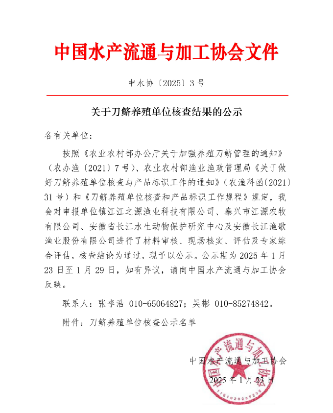 按照《农业农村部办公厅关于加强养殖刀鲚管理的通知》(农办渔〔2021〕7号)、农业农村部渔业渔政管理局《关于做好刀鲚养殖单位核查与产品标识工作的通知》 (农渔科函〔2021〕31号)和《刀鲚养殖单位核查和产品标识工作规程》规定,我会对申报单位镇江江之源渔业科技有限公司、泰兴市江源农牧有限公司、安徽省长江水生动物保护研究中心及安徽长江渔歌渔业股份有限公司进行了材料审核、现场核实、评估及专家综合评估,核查结论为通过,现予以公示。公示期为2025年1月23日至1月29日,如有异议,请向中国水产流通与加工协会反映。