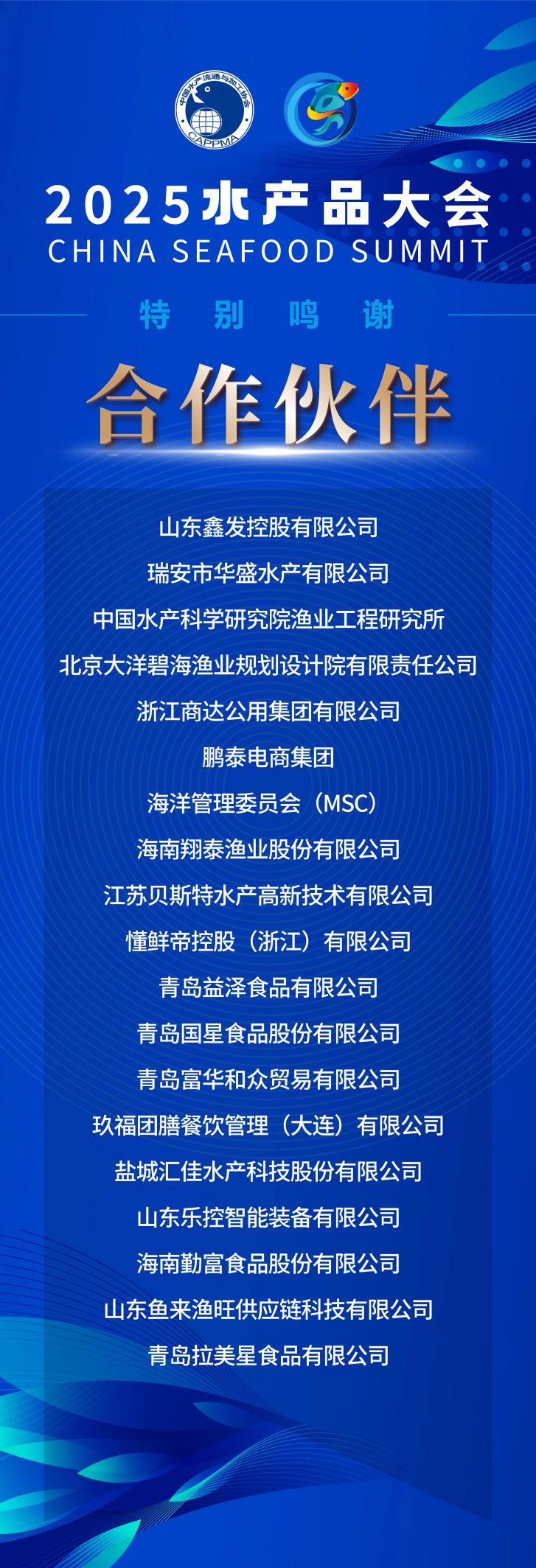 特别鸣谢以下合作伙伴对本次大会的大力支持:山东鑫发控股有限公司、瑞安市华盛水产有限公司、中国水产科学研究院渔业工程研究所、北京大洋碧海渔业规划设计院有限责任公司、浙江商达公用集团有限公司、鹏泰电商集团、海洋管理委员会(MSC)、海南翔泰渔业股份有限公司、江苏贝斯特水产高新技术有限公司、懂鲜帝控股(浙江)有限公司、青岛益泽食品有限公司、青岛国星食品股份有限公司、青岛富华和众贸易有限公司、玖福团膳餐饮管理(大连)有限公司、盐城汇佳水产科技股份有限公司、山东乐控智能装备有限公司、海南勤富食品股份有限公司、山东鱼来渔旺供应链科技有限公司、青岛拉美星食品有限公司。